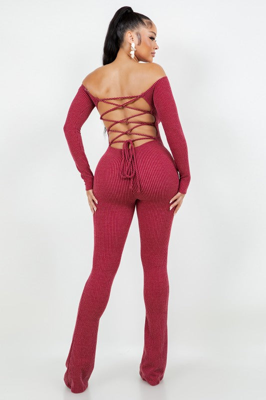 Slip into this ribbed jumpsuit for a luxurious and curve-hugging fit. The breathable fabric keeps you comfortable while the lace up back adds a touch of style. Perfect for a night out or a casual day out.